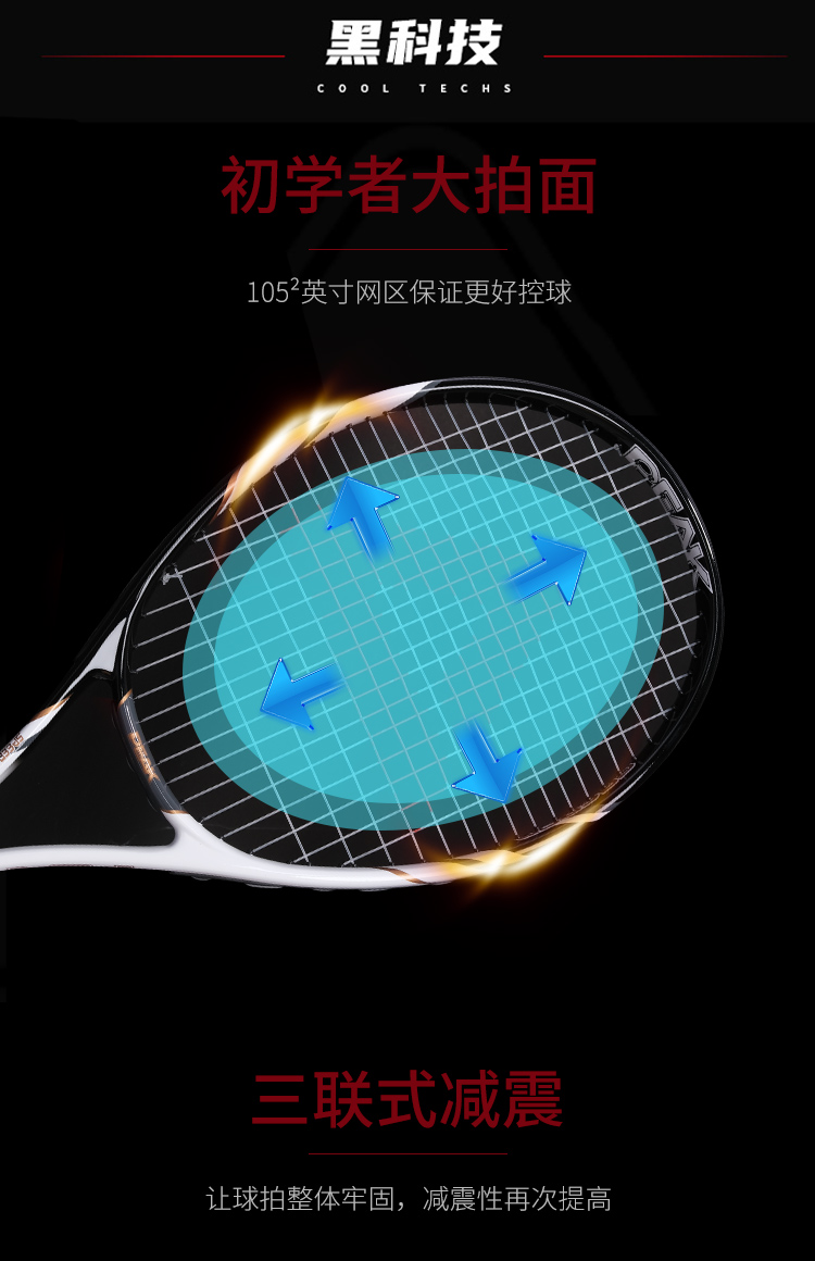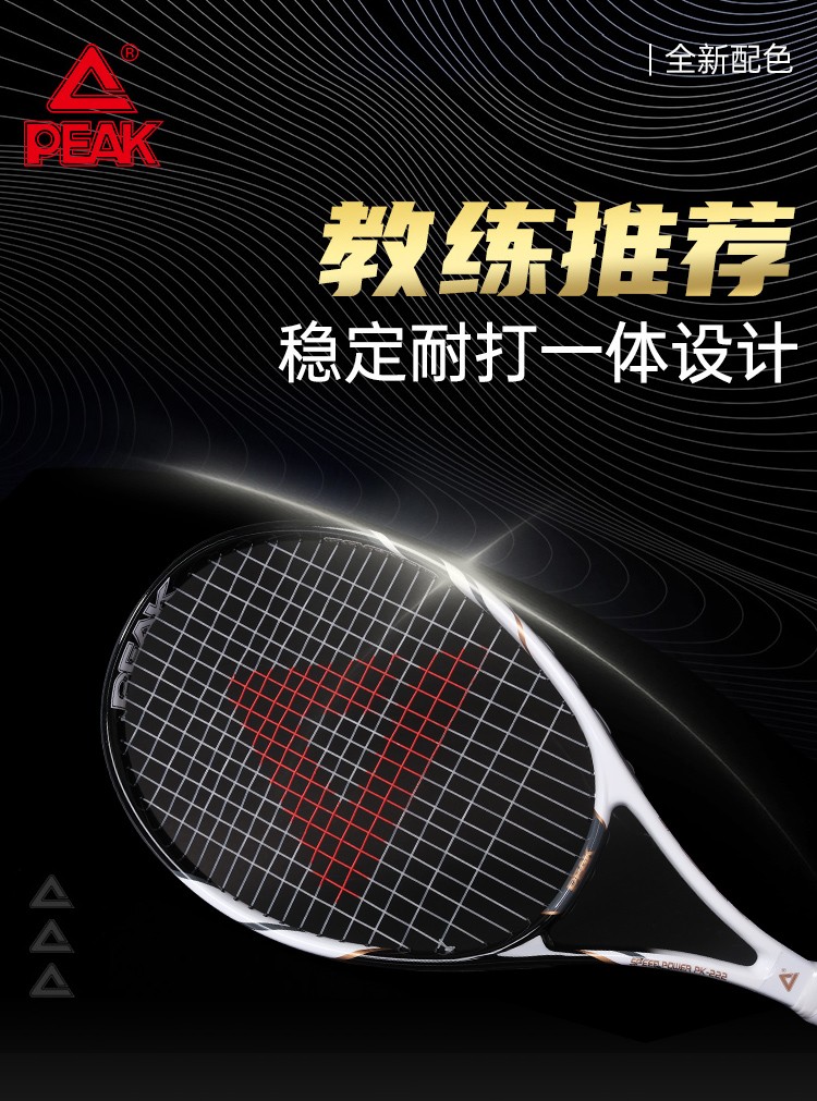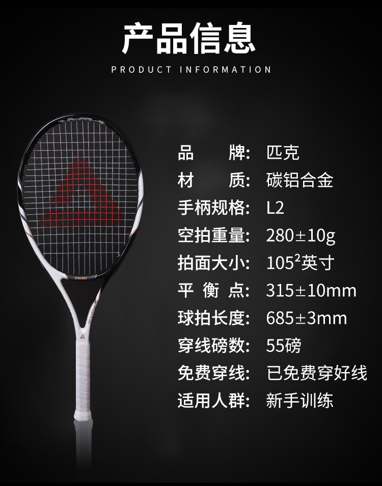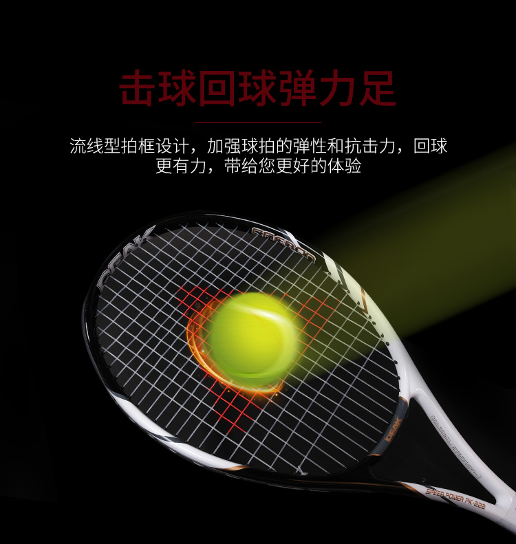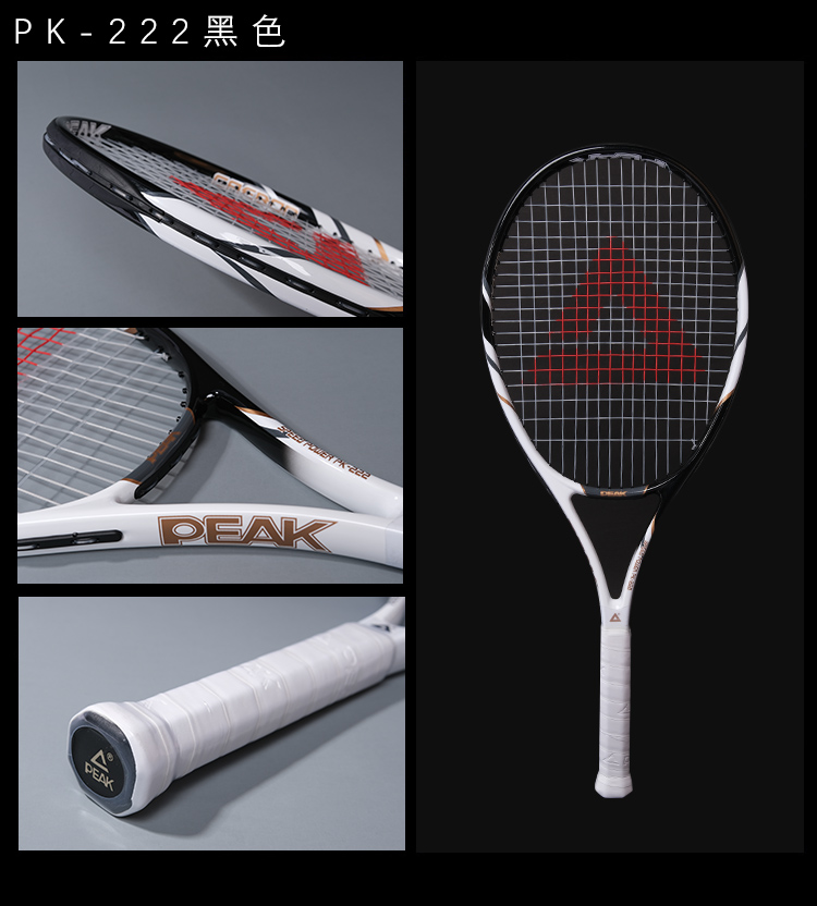 匹克(PEAK)网球拍男女初学者专业碳铝单只PK-222黑色(已穿线)含训练器 手胶 网球3个 拍包 避震器
