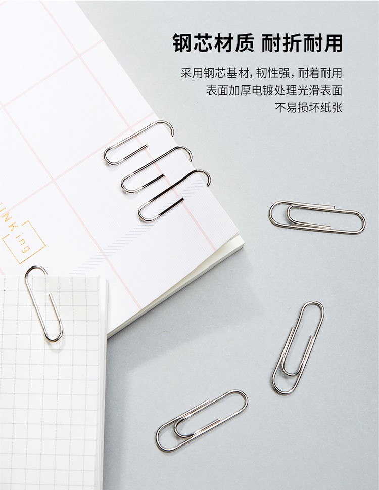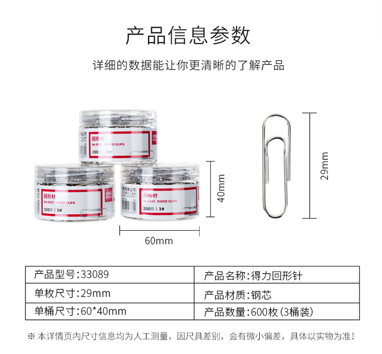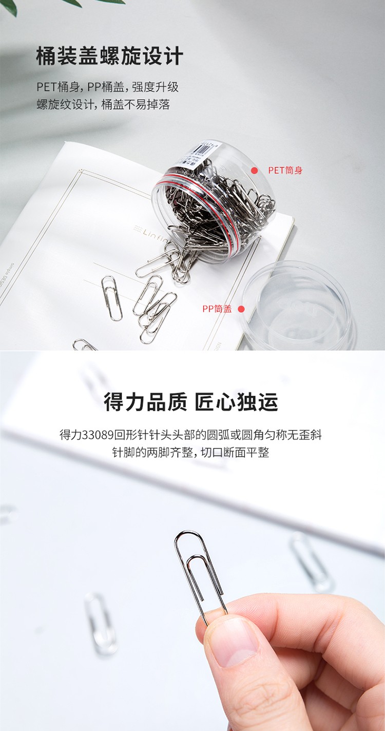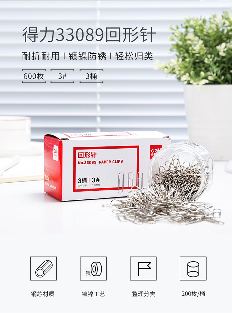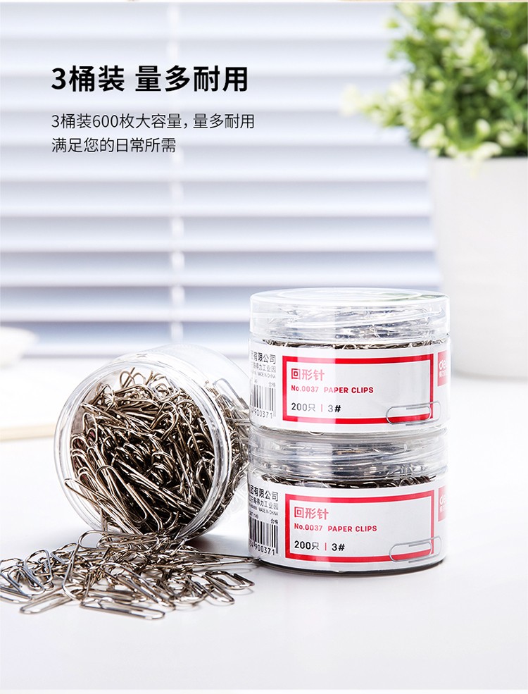 得力(deli)29mm镀镍回形针 3#金属曲别针 200枚/筒 3筒装 办公用品 33089